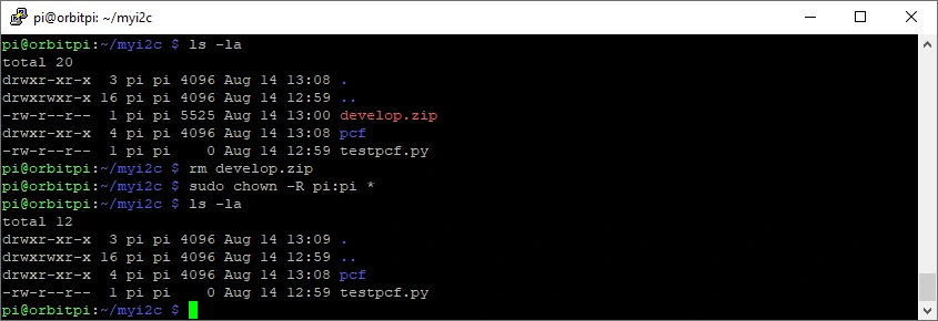 cd /home/pi sudo mkdir myi2c sudo chown pi:pi myi2c cd myi2c sudo touch testpcf.py sudo chown pi:pi testpcf.py